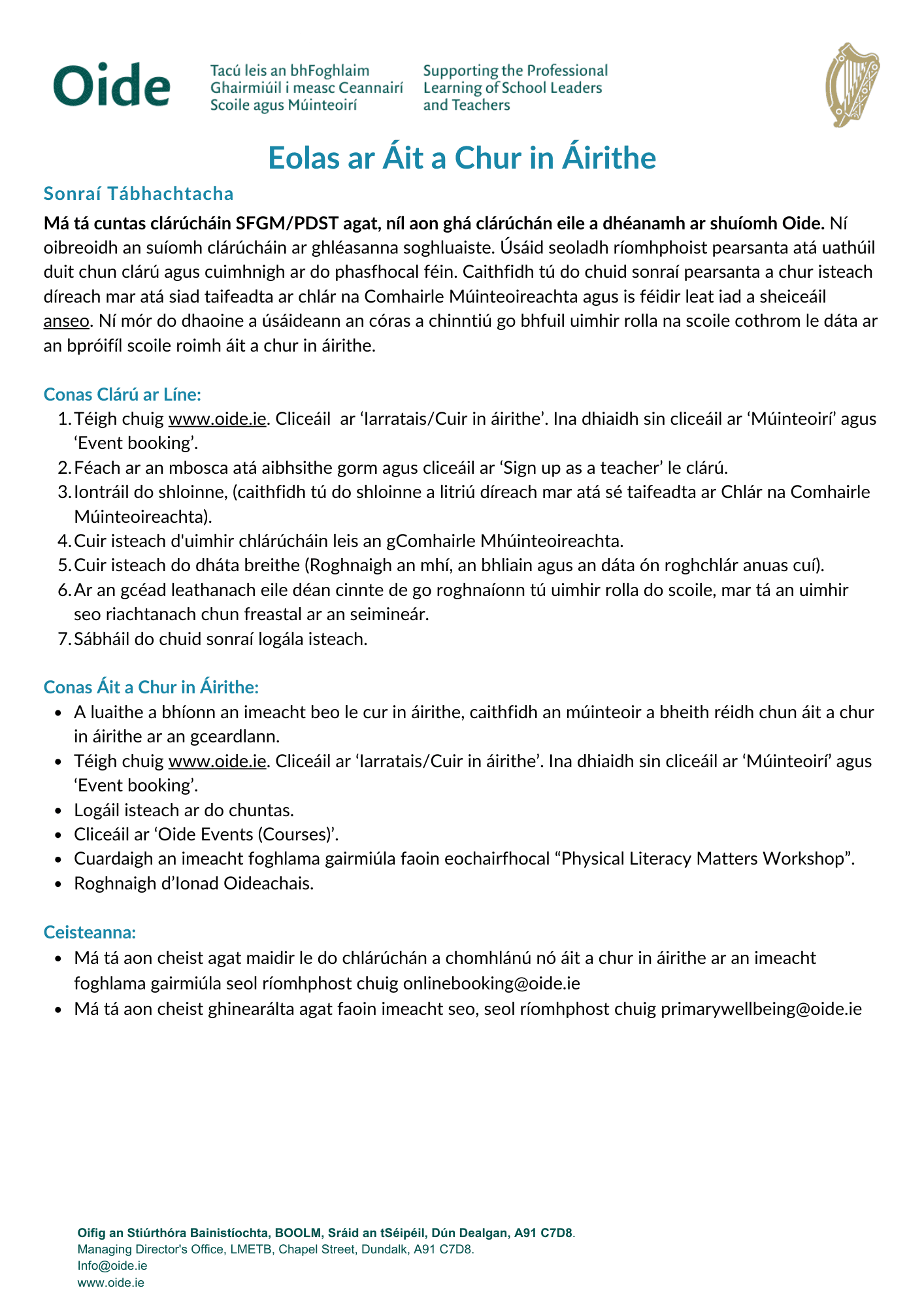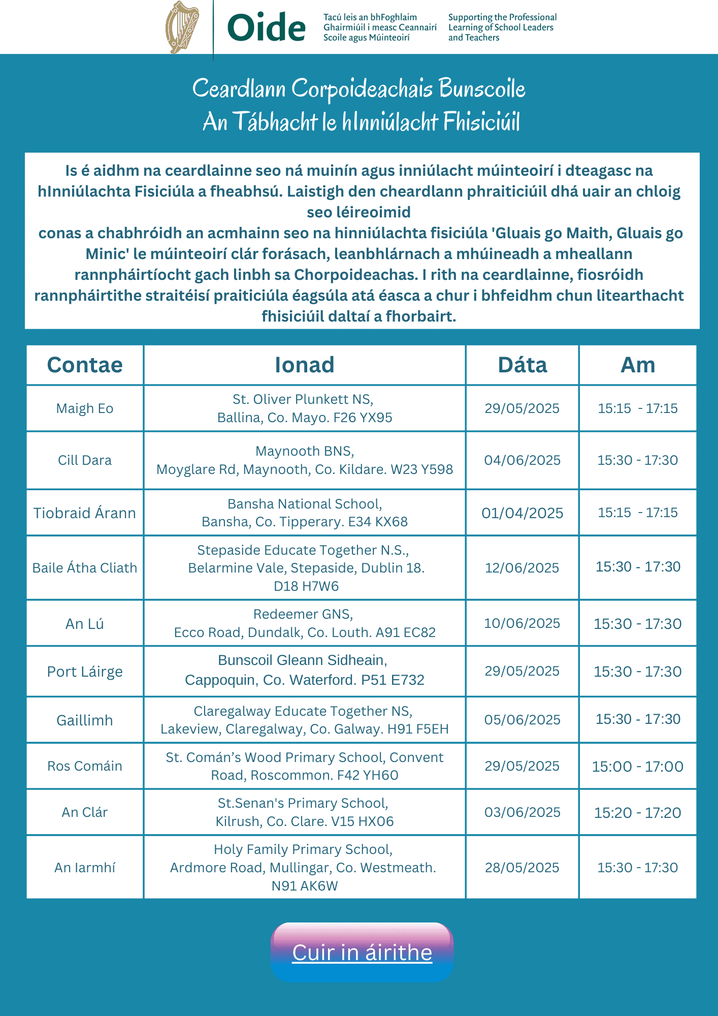 I rith na ceardlainne, fiosróidh rannpháirtithe straitéisí praiticiúla éagsúla atá éasca a chur i bhfeidhm chun litearthacht fhisiciúil daltaí a fhorbairt. Tá tuilleadh sonraí ar fáil ar an mbileog leis seo.
