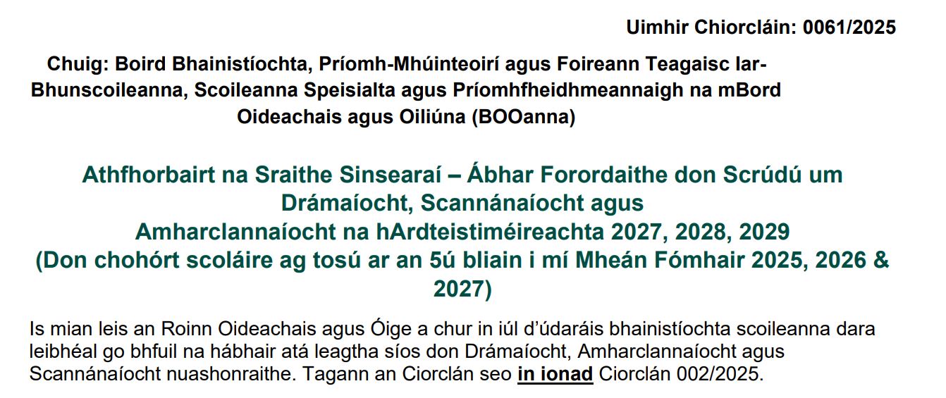 Nuacht agus Uasdátuithe HomeIar-bhunscoilLéann na Drámaíochta, na Scannán & na hAmharclannaíochta Nuacht agus Uasdátuithe news November 2025 Nóta faisnéise do scoileanna Samhain 2025, Eagrán 13 news October 2025 Ciorclán 0061/2025: Athfhorbairt na Sraithe Sinsearaí news October 2025 Coimre Shamplach – Staidéar Drámaíochta, Scannánaíochta agus Amharclannaíochta news September 2025 Ciorclán 0064/2025, Athfhorbairt na Sraithe Sinsearaí Cláraigh chun nuacht a fháil agus nuashonruithe Cláraigh anseo