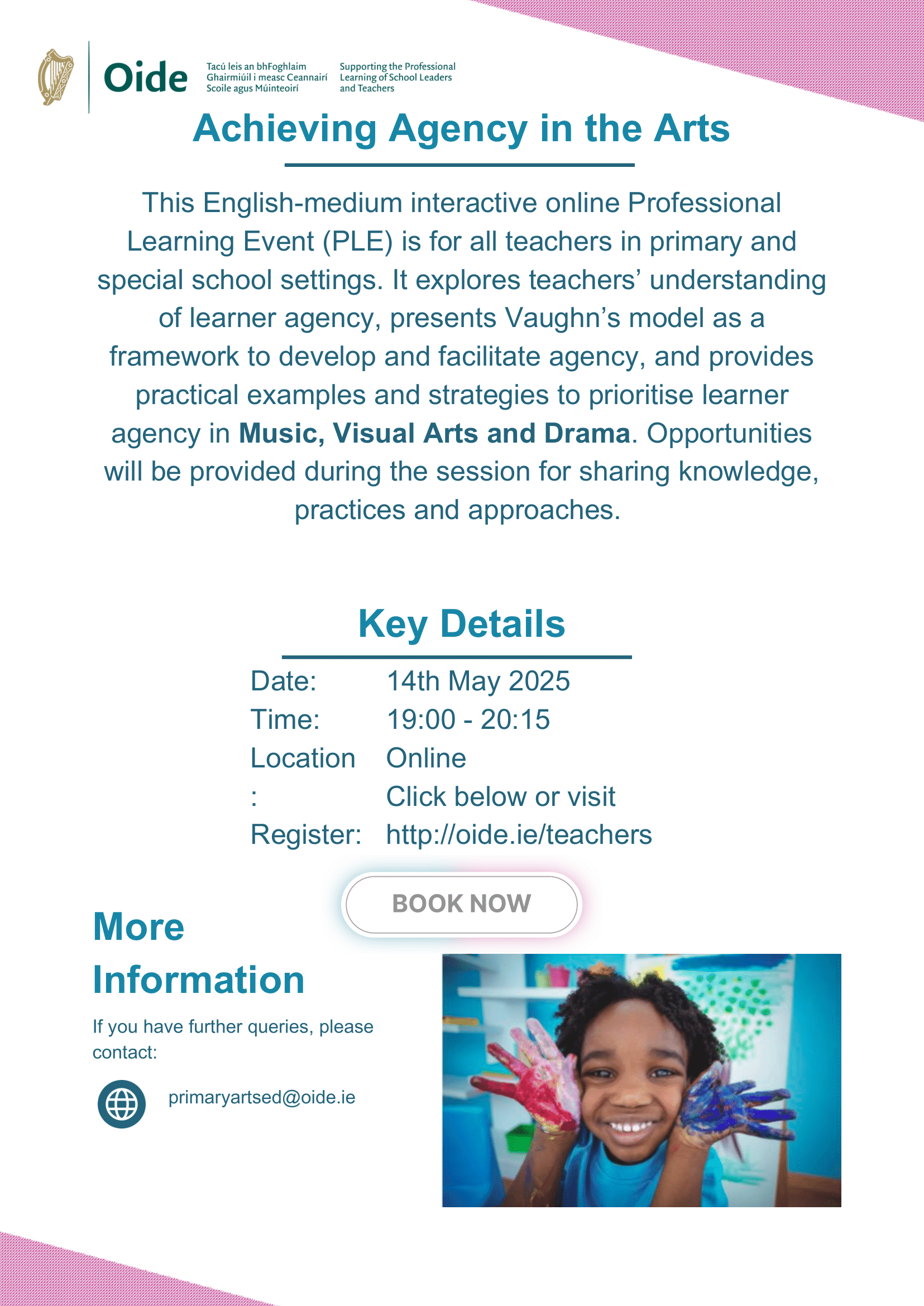 Oide Primary Arts Education Team are delighted to share details of our Achieving Agency in the Arts online interactive Professional Learning Event (PLE). This English-medium PLE will emphasise the need to foster and develop an inclusive approach to learner agency in the Arts, at all stages of learning. This PLE will facilitate collaboration and the development of an understanding of learner agency. Participants will have an opportunity to explore and share strategies to prioritise learner agency in arts education in their own setting. Details below and register here.