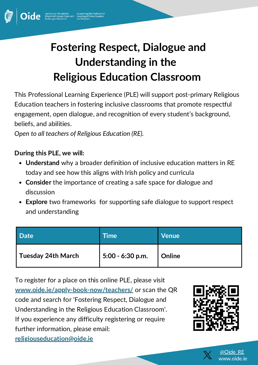 The Oide Religious Education Team is delighted to invite post-primary teachers to an upcoming online Professional Learning Experience (PLE), Fostering Respect, Dialogue and Understanding in the Religious Education Classroom.