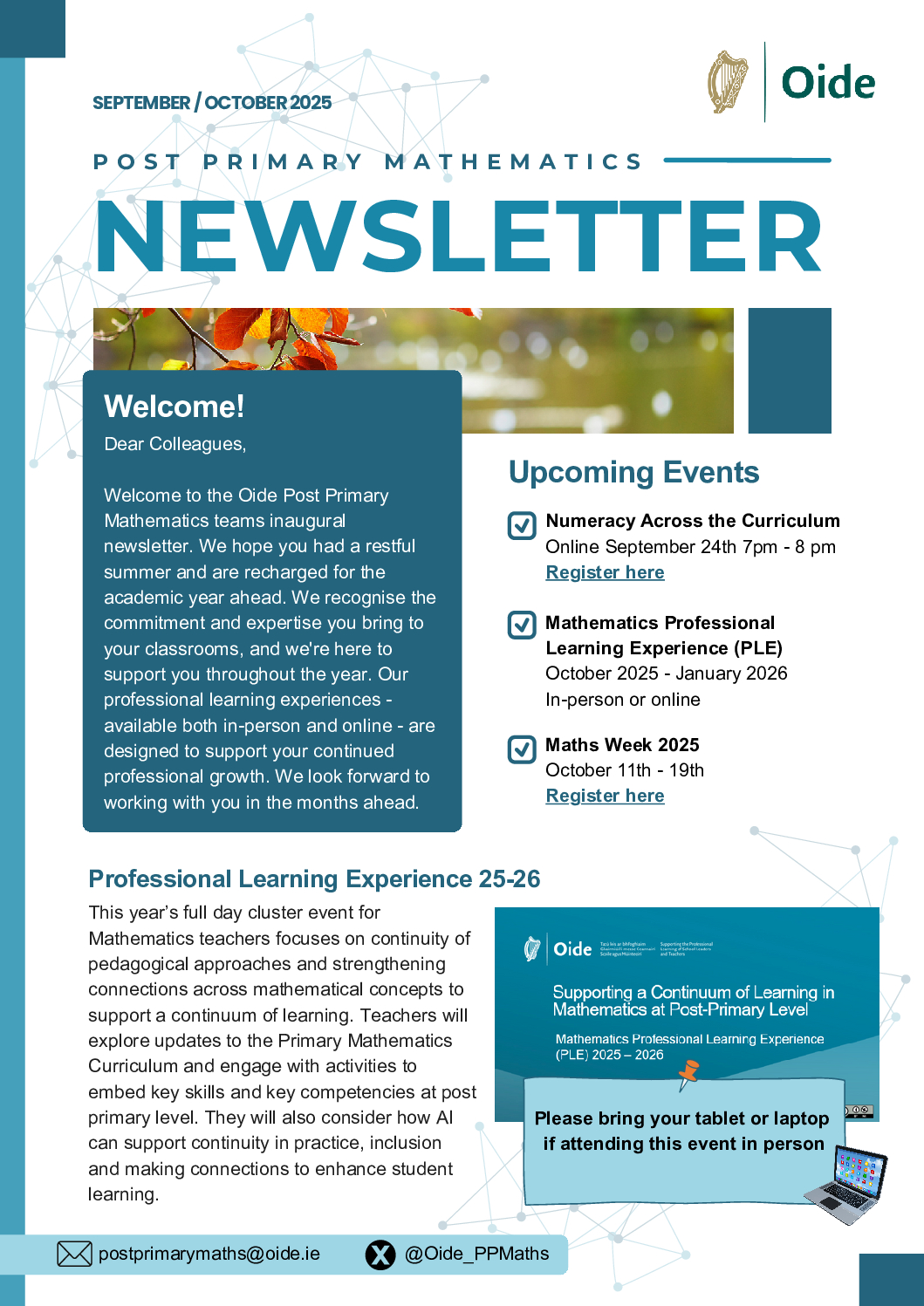 News & Updates HomePost-PrimaryMathematicsMathematics Senior CycleNews & Updates news November 2025 Post Primary Mathematics Newsletter Winter 2025 news October 2025 Post Primary Mathematics Newsletter September/October 2025 news May 2024 Updates news April 2024 Computer Science Week Sign up to receivenews and updates Sign Up